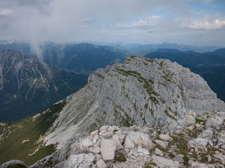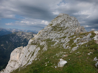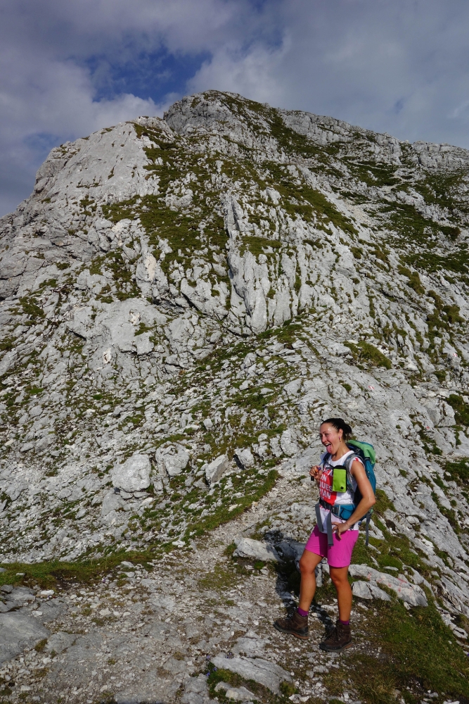 Allerdings schneller als uns lieb war, wechselten wir auch schon wieder vom versicherten Steig ins schrofige Gelände. Über die Platten hinauf haben wir fast schon zu viel Gas gegeben, und so standen wir mit glühender Birne am Sattel zwischen Guffertstein und der Guffertspitze. Die Sonne hatte heute aber auch ordentlich Power.