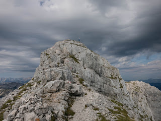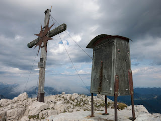 Noch waren wir nicht am Ziel, und so ging es gleich rechts weiter hinauf zum Gipfel. Auch hier gab es noch ein paar versicherte Stelle zu überwinden, dann standen wir endlich am ersehnten Guffert-Kreuz – vor uns lediglich ein einsamer Trailrunner, dem ich meinen tiefsten Respekt aussprechen muss.