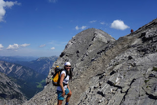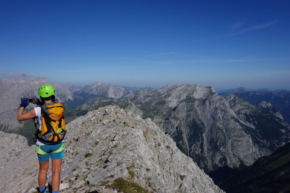 Ich weiß noch ganz genau, wie ich dachte, dass wir das Bergchen nun auf der linken Pobacke abreiten würden, nachdem, was wir schon gemacht hatten. Haha!!! Vor allem, nachdem was wir schon in den Knochen hatten. Der Aufstieg zum Sonnjoch hat uns noch einmal gewaltig gefordert. Anfangs über Latschen, wurde der Karwendelschrott nach oben immer mehr. Ich wollte mir überhaupt gar keine Gedanken darüber machen, wie ich auf dem losen Geröll jemals wieder heil herunter kommen soll. Noch zudem brannte die Sonne uns erbarmungslos in den Nacken. Wenn ich jemals bei einer Bergtour konditionell fast an meine Grenzen gestoßen bin, dann war das heute.