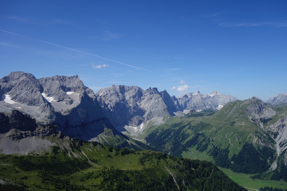 So ging es am Westlichen Lamsjoch erst einmal zum Hahnkampl hinauf. Von dort hatten wir eine gigantische Sicht auf das Sonnjoch, den Rauen Knöll und auch zurück auf die Lamsenspitze.