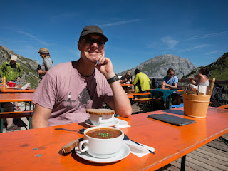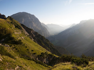 Es war herrlich, als die Sonne so langsam über dem Karwendel aufging und die Berge erst in rotes, dann in goldenes Licht tauchte. So etwas kann man nur erleben, wenn man auf der Hütte schläft oder eben wie wir sehr sehr früh dran ist.
