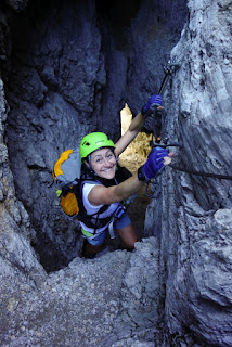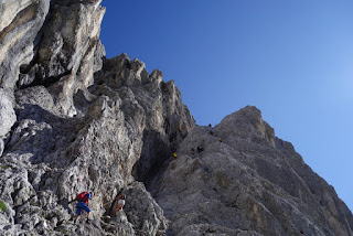 Am weniger anspruchsvollen Gipfel-Klettersteig ging es auf gleichem Wege zurück. Ich weiß nicht, was sich in der letzten halben Stunde geändert hatte, aber inzwischen kamen uns Scharen von Leuten entgegen, vorzugsweise ohne Helm. Gut, dass die Felsen hier so brüchig sind…