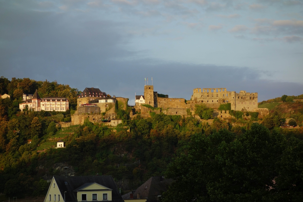 Noch bevor überhaupt jemand den Morgen mit uns teilen konnte, waren wir schon wieder zum Aufbruch bereit. Erst einmal ging es erneut hinunter nach Sankt Goarshausen. Dort erwartete uns auf der anderen Seite ein kleiner Klettersteig, den wir keinesfalls auslassen wollten. Über den 500 Meter langen Rabenacksteig ging es dann wieder aufs alte Höhenniveau hinauf. Stellenweise etwas ausgesetzt, stellte sich bei uns versierten Berggehern kein so rechter Nervenkitzel ein. Aber Spaß gemacht hat es trotzdem, und die Ausblicke waren wir immer gigantisch. Die Burg Rheinfels wirkte von hier zum Greifen nah.