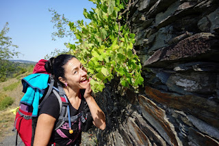 Das allerbeste war aber ein kleiner Schrein vom Weingut Hillesheim, der direkt am Wegesrand angebracht war. Flo hätte ihn fast übersehen. Aber da ich meinte, irgendwann irgendwo mal etwas gelesen zu haben, öffneten wir ihn neugierig. Und tatsächlich, darin befanden sich Gläser und kleine Probierfläschchen neben einer Geldkassette. Wenn es uns auch mehr ums Wandern als ums Trinken geht, hatten wir uns trotzdem ein kleine Belohnung verdient.