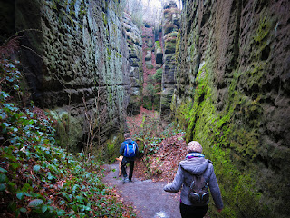 Gut, dass wir den Weg zu den Schrammsteinen schon genießen konnten, denn kurz davor war plötzlich Schluss. Was wir nicht bedacht hatten, mit Hund ist es einfach nicht möglich, die Eisenleitern an den Felsen rauf- und runterzuklettern. So blieb uns nur die Möglichkeit, schweren Herzens wieder umzudrehen und zu einem anderen Zeitpunkt alleine wiederzukommen.