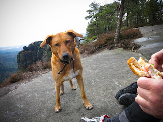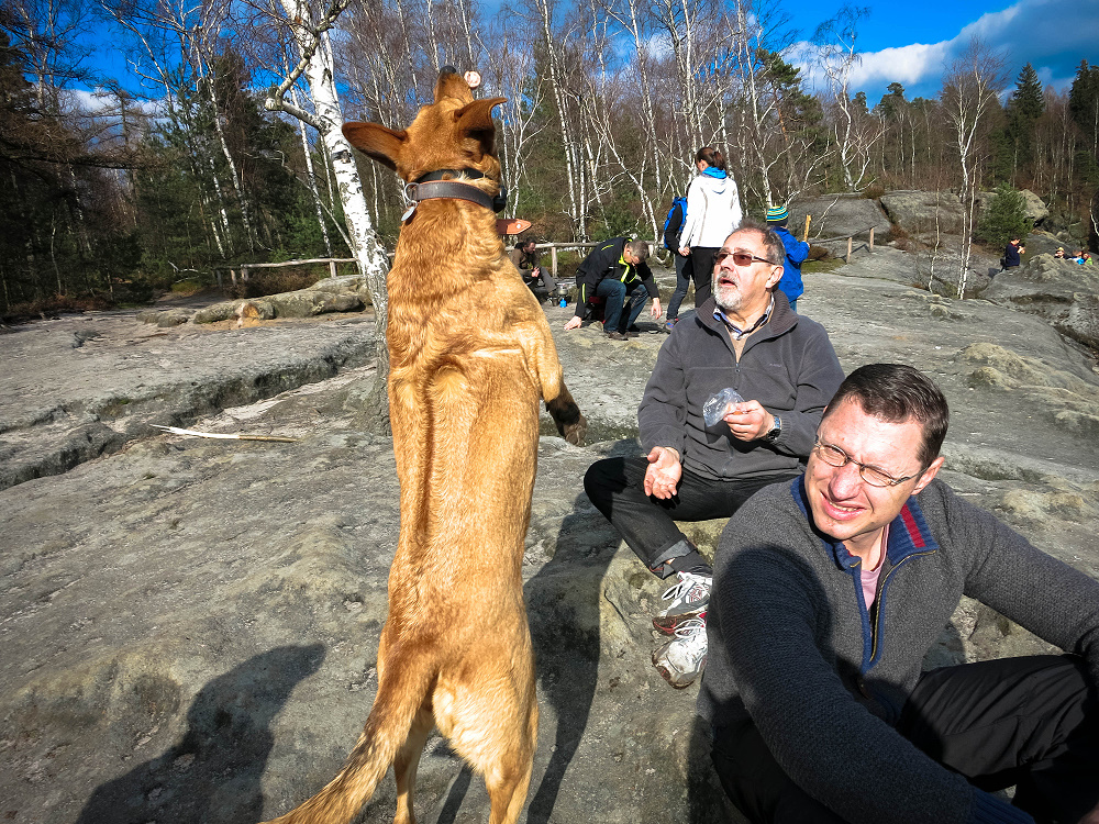 Doch bevor wir nun endgültig zu den Schrammsteinen vorrücken wollten, mussten wir uns erst ein wenig stärken – wie gewohnt beim Picknick im Freien. Was Emmi wohl dabei gedacht haben muss. Mein Vater hat sich als wahrer Sadist herausgestellt. Doch später gab’s natürlich auch noch was fürs Tierchen…